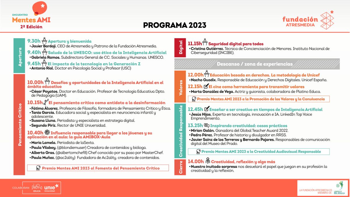 El II Encuentro Mentes AMI, organizado por la Fundación Atresmedia en colaboración de Platino Educa y UNIE Universidad, contará con un programa lleno de personalidades y contenidos relevantes para la comunidad educativa donde se va a reflexionar, aprender y debatir entre la comunidad docente en torno a la aplicación de la Alfabetización Mediática e Informacional (AMI) en el sistema educativo. ¡Los maestros y profesores que asistirán vivirán una jornada inolvidable!