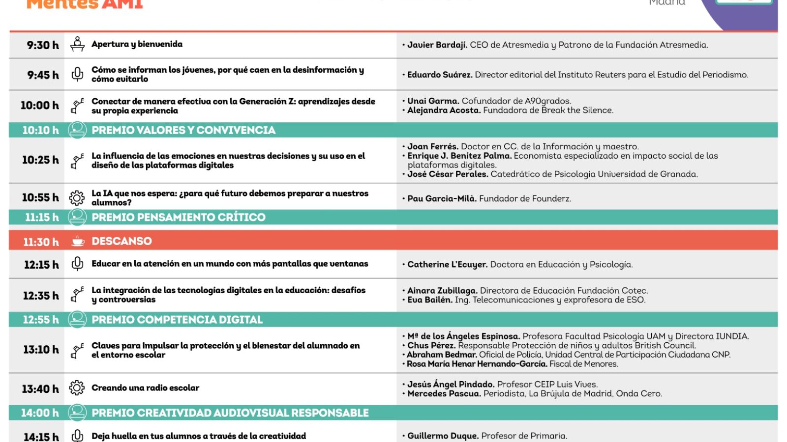 Durante el evento, la Fundación Atresmedia hará entrega de los Premios Mentes AMI 2025a los proyectos ganadores en las categorías de Valores y Convivencia, Pensamiento Crítico, Competencia Digital y Creatividad Audiovisual Responsable. Estos galardones, que este año han recibido cerca de 350 candidaturas, reconocen el compromiso de docentes y centros educativos de toda España por integrar en las aulas las competencias mediáticas, informacionales y digitales, impulsando el pensamiento crítico, la creatividad, la convivencia y el uso responsable de la tecnología.