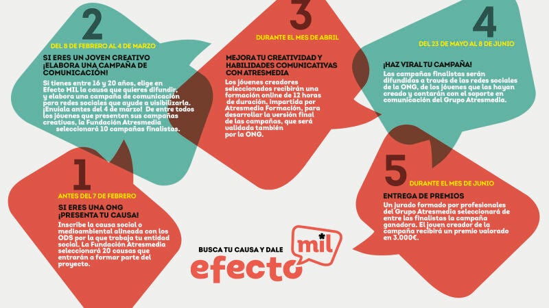 Las entidades que deseen participar podrán presentar su causa en efectomil.org antes del 7 de febrero y la Fundación Atresmedia seleccionará las 20 causas que entrarán a formar parte del proyecto. Después, jóvenes de entre 16 y 25 años con habilidades para crear contenido en las redes sociales y con inquietud solidaria, elegirán la causa con la que se sientan más comprometidos y prepararán una campaña de comunicación digital para aumentar su impacto.