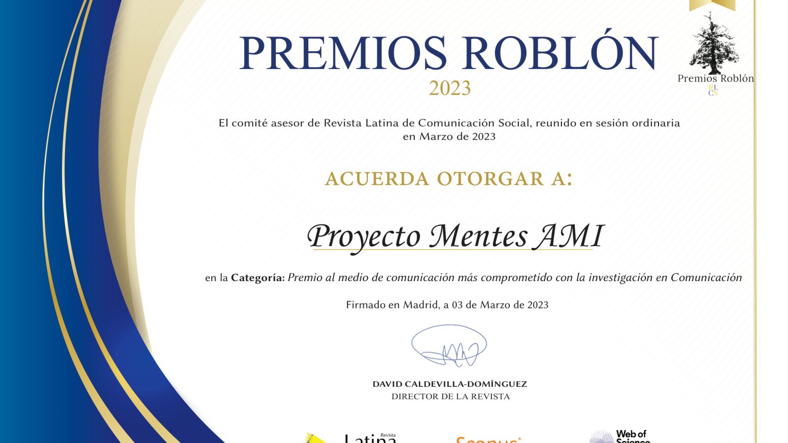 La Fundación Atresmedia ha sido distinguida con el Premio al Medio de Comunicación más comprometido con la Investigación en Comunicación en los Premios Roblón, concedidos por la Revista Latina de Comunicación Social (RLCS) en virtud de su papel destacado en la creación del Encuentro Mentes AMI, una gran cita dirigida a la comunidad educativa para facilitar a los profesores herramientas que les ayuden a trasladar competencias mediáticas, informacionales y digitales en las aulas.